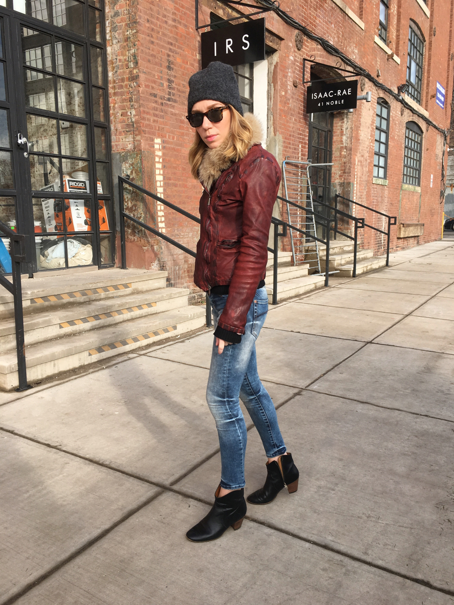 Hello hello everyone! How are all of you doing?! I’ve been up since 6am, went to bed super early last night like a grandma but really needed the sleep. I woke up this morning and immediately wanted to get right on this post for all of you of my look from yesterday. I get so excited when there are those few days here in NY where it gets a bit warmer and I can get away with wearing just a short leather jacket. Especially when I find a great leather that’s in another color other than black, I want to wear it every chance I get.